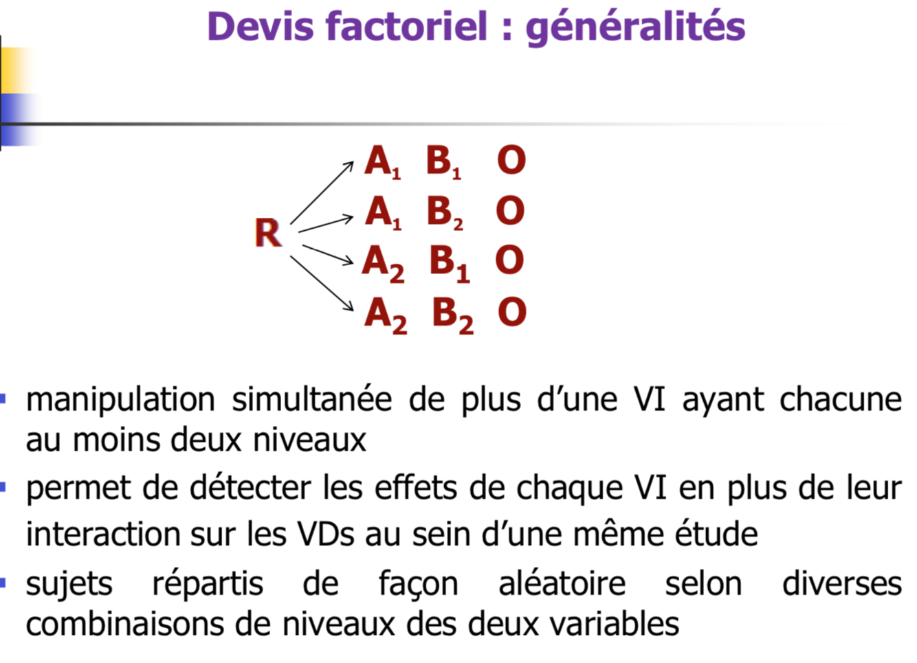 • Le chercheur évalue les effets d’un traitement ou d’une intervention (VI) sur d’autres variables (VDs)