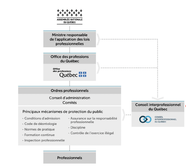 Dans le système professionnel québécois, que retrouve-on sous l’assemblée nationale du Québec?