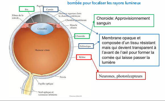 - Choroïde : réseau de vaisseaux sanguins qui apporte oxygène et nutriments à la macula.