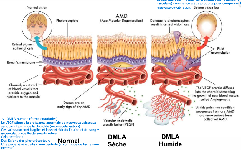 - Ces vaisseaux sont fragiles et laissent fuir du liquide et du sang → accumulation de fluide sous la rétine.