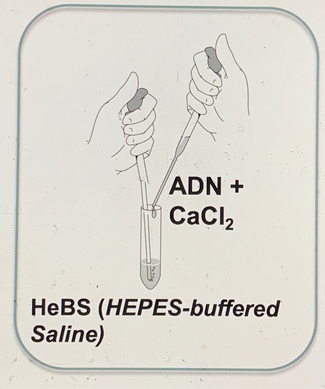 formation d’un précipité —> mélange lentement une solution phosphate tamponée et une solution de chlorure de calcium (CaCl2) contenant l’ADN.