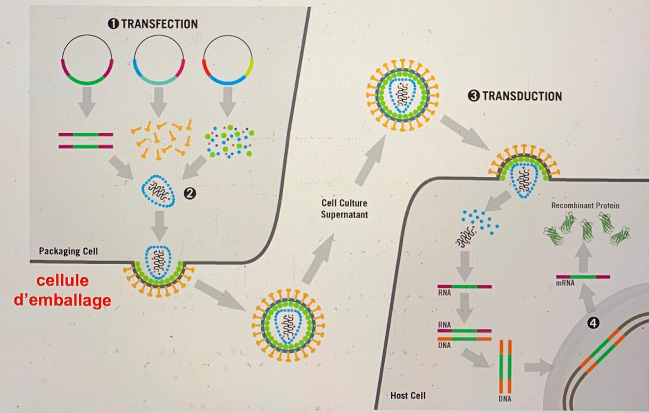 1) cellule d’emballage fabrique des virus avec le gène d’intérêt