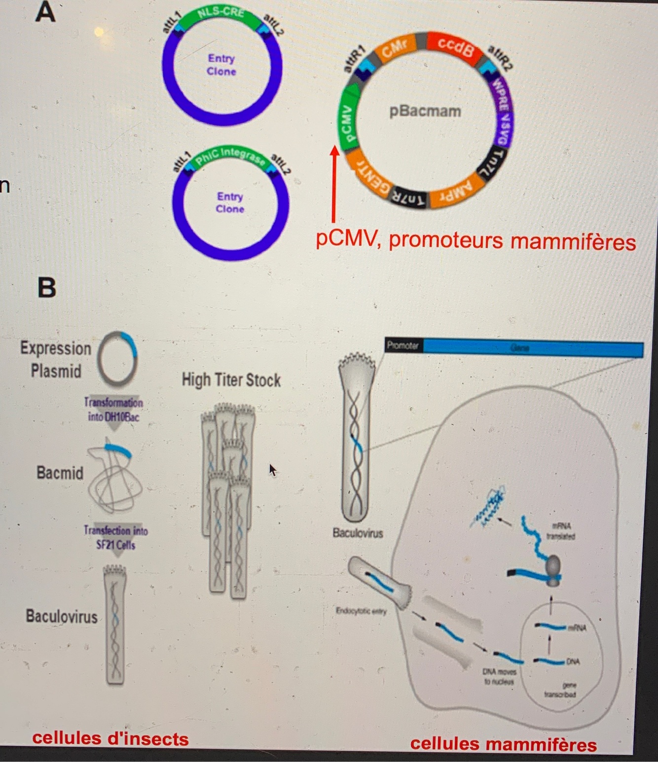 • bacmid insère dans souche de E. coli (selection bleu/blanc) pour replication et l’ADN est ensuite inséré dans c insecte = stock de baculovirus