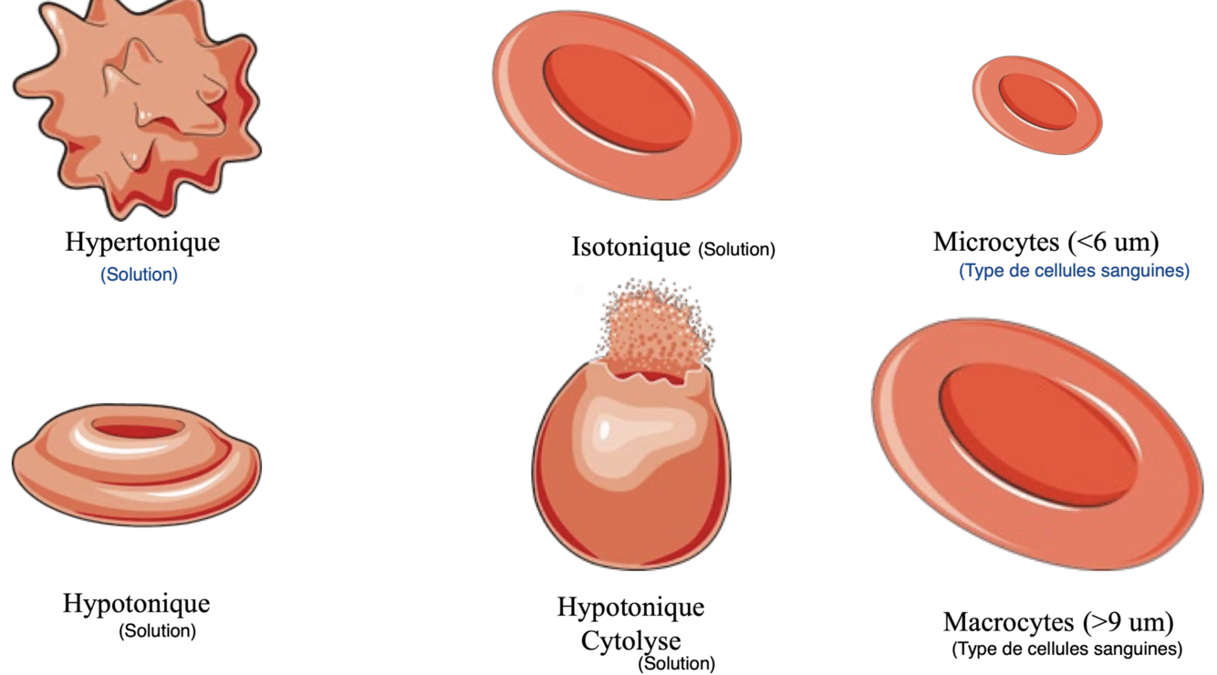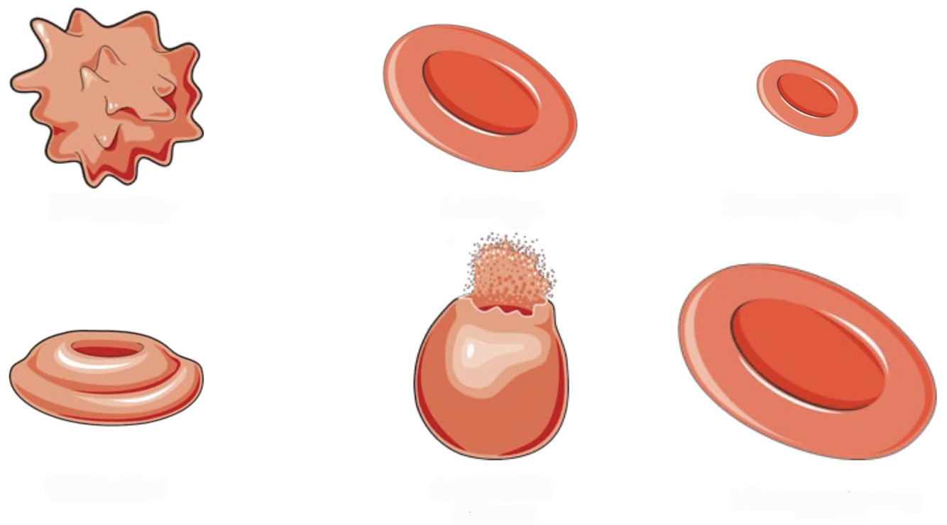 Nomme les solutions ou type de cellules sanguines associés aux formes des globules rouges sur l’image