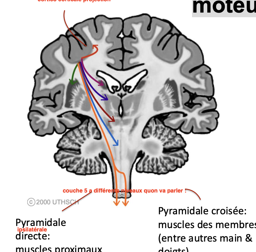 pyramidale directe (ipsilatérale) : muscles proximaux-axiaux (tronc, cou, épaules, doit etre volontaire sinon pas voie descendante)