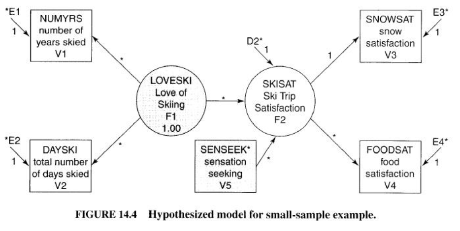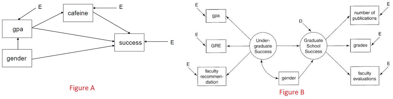 Dans les diagrammes des relations des équations structurelles, la variable mesurée/observée/manifeste est représentée par un carré/rectangle; la variable inférée/non-observée/latente est représenté par un cercle/ovale; une relation est indiquée par une flèche; la direction de la relation est indiquée par la direction de la flèche; l’erreur est représentée par un E et l’erreur de la variable latente est représentée par un D