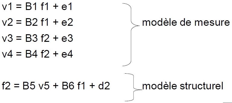 Dans une équation structurelle, chaque VI ou VD peut être mesurée directement (variable […]) ou assumée par un construit (variable […])