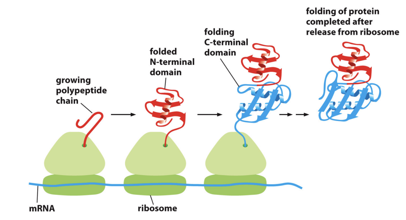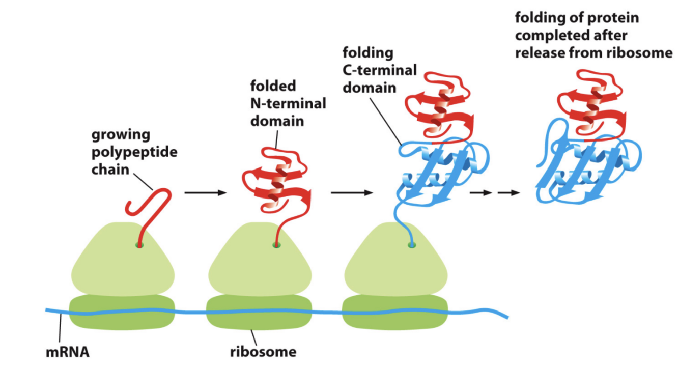 Dès que la chaîne polypeptidique est suffisamment longue pour créer des domaines protéiques, la protéine commence à adopter sa structure finale tridimensionnelle même en cours de traduction