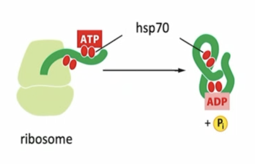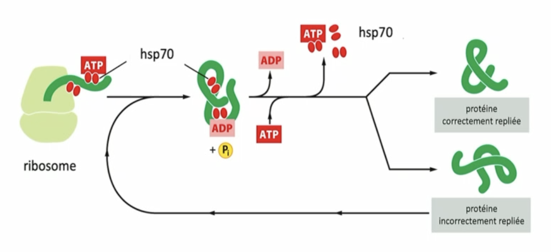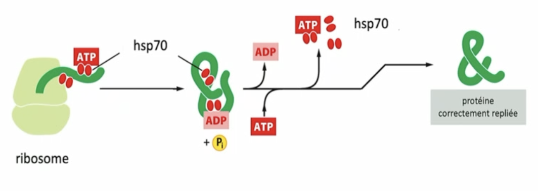 Chaperon hsp70 reconnaissent et engagent ces structures hydrophobes (en s’y fixant) pour les couvrir et ainsi laisser le temps à la protéine de terminer sa synthèse et d’adopter sa forme finale