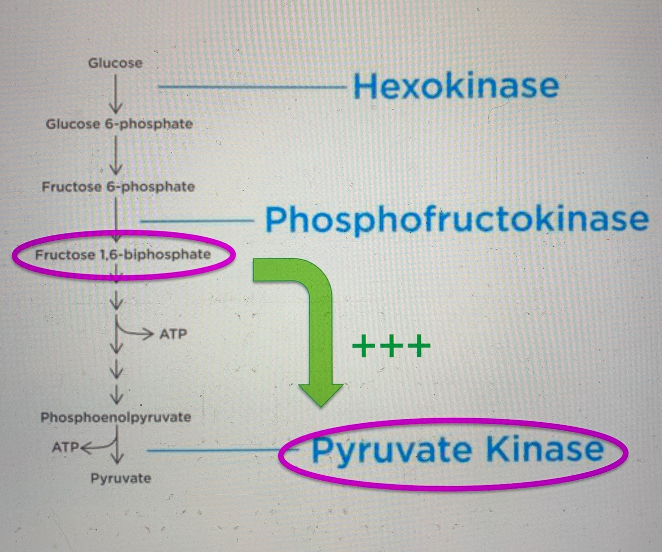 Le Fructose-1,6-bisphosphate (FBP) se lié à la pyruvate kinase (PK), sur un site distinct de la fixation du substrat (= allostérique)