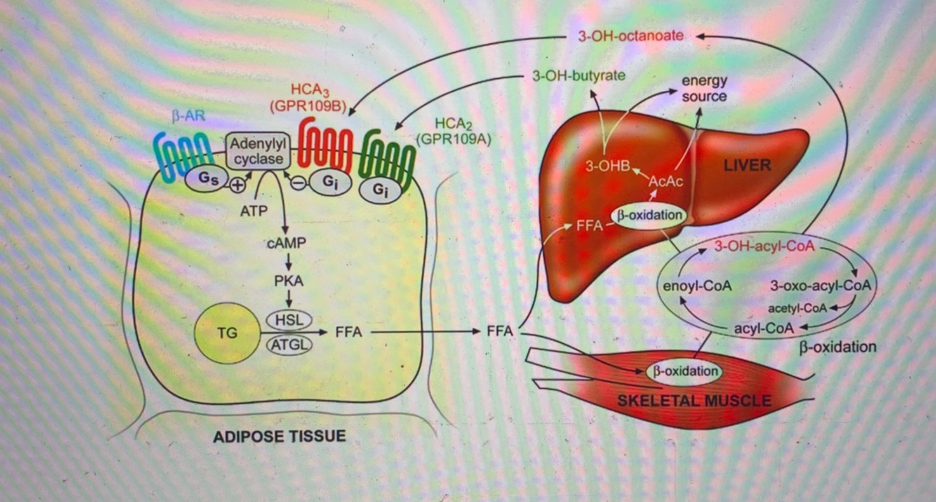 —> inhibe la lipolyse et beta-oxidation (cétogenèse est alimentée par la beta-oxidation)