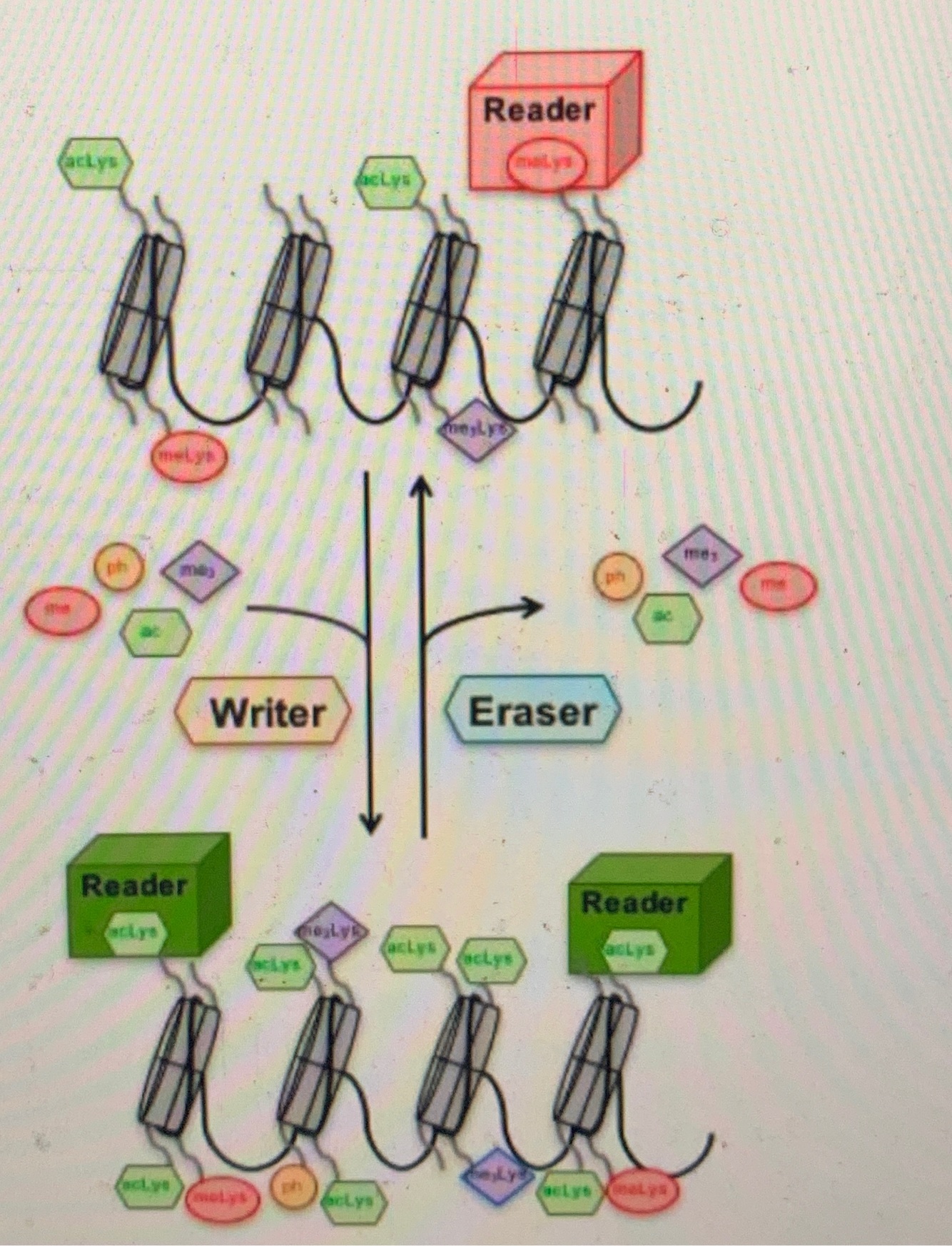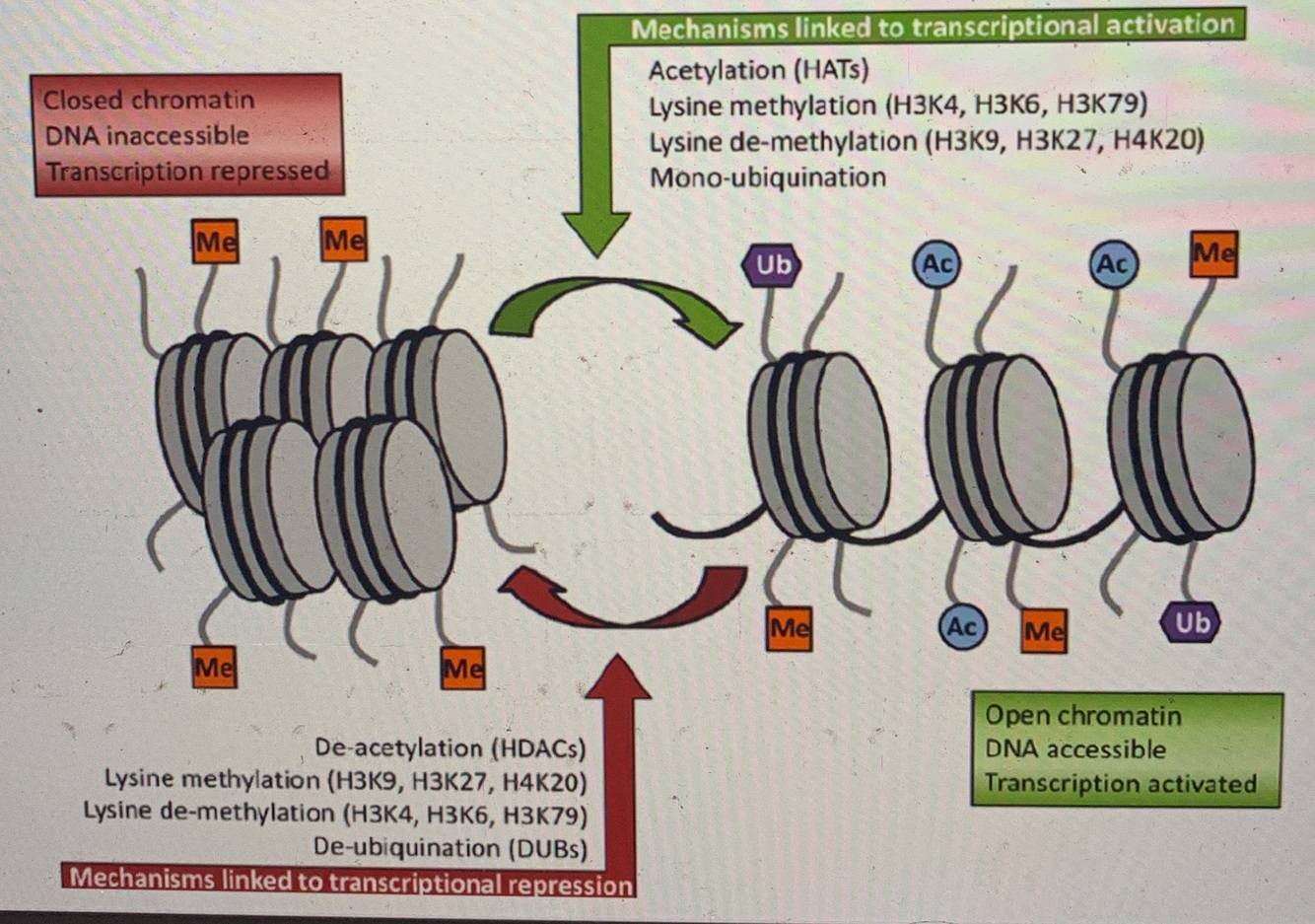 • la modification des histones (acétylation, phosphorylation, méthylation et ubiquitylation)