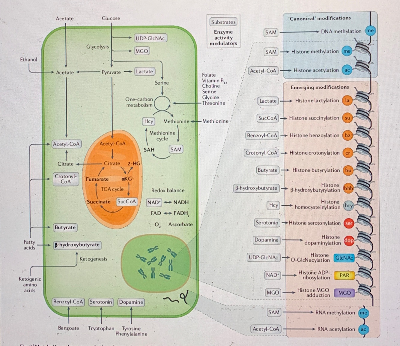 actyl-CoA, succinyl-CoA, benzoyl- CoA; S-Adenosylmethionine (SAM); lactate, b-hydroxybutyrate, homocystéine, butyrate