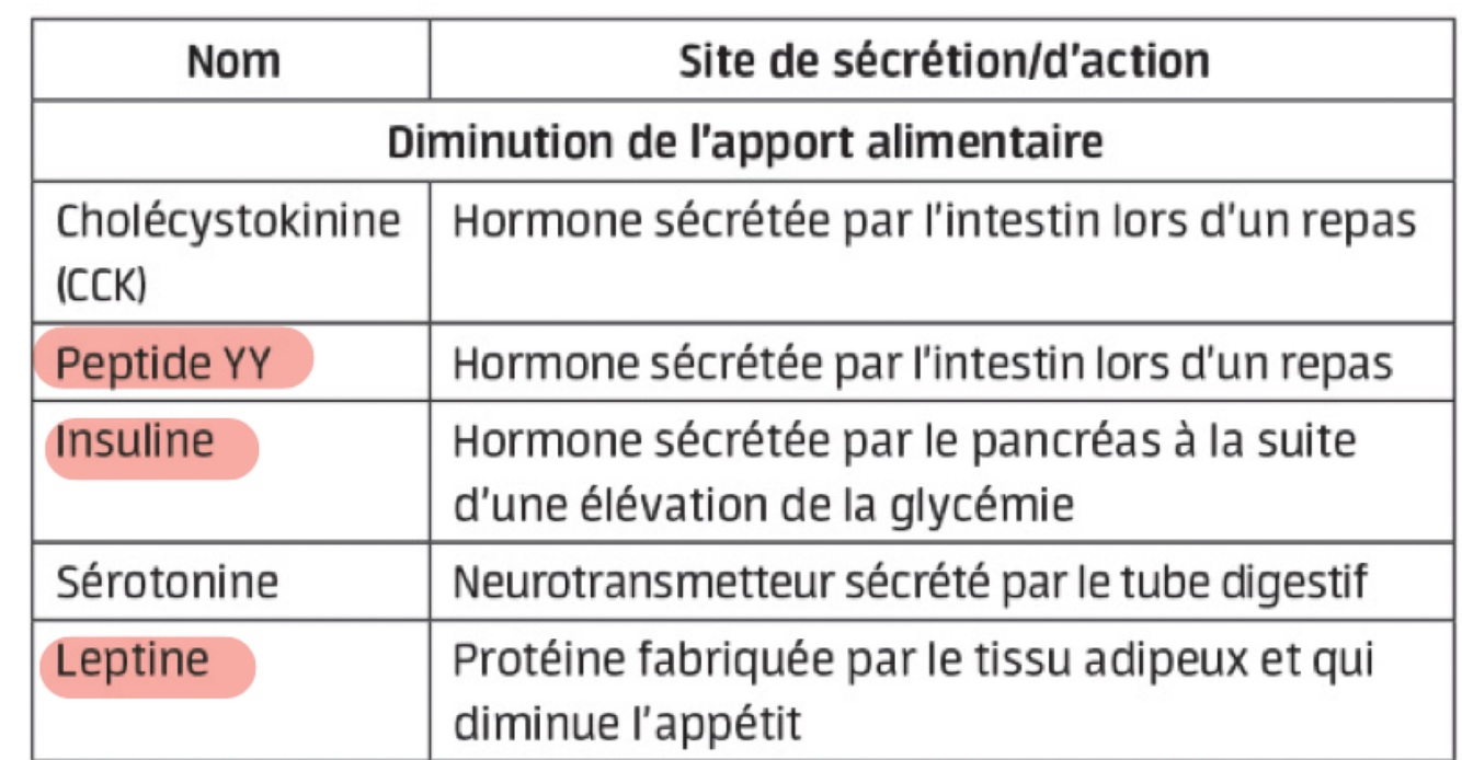 Les hormones (5) et leurs sites de sécrétion qui diminuent l’apport alimentaire