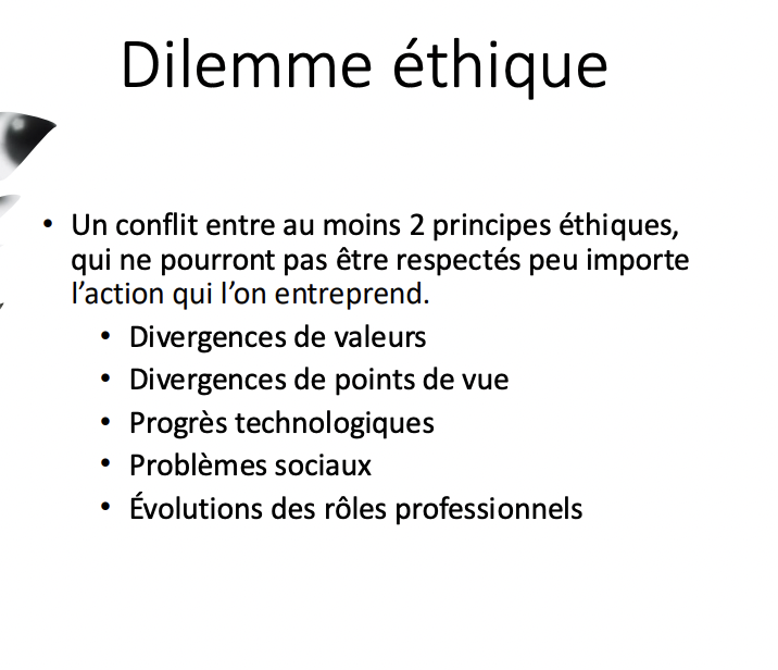 Un conflit entre au moins 2 principes éthiques, qui ne pourront pas être respectés peu importe l’action qui l’on entreprend.