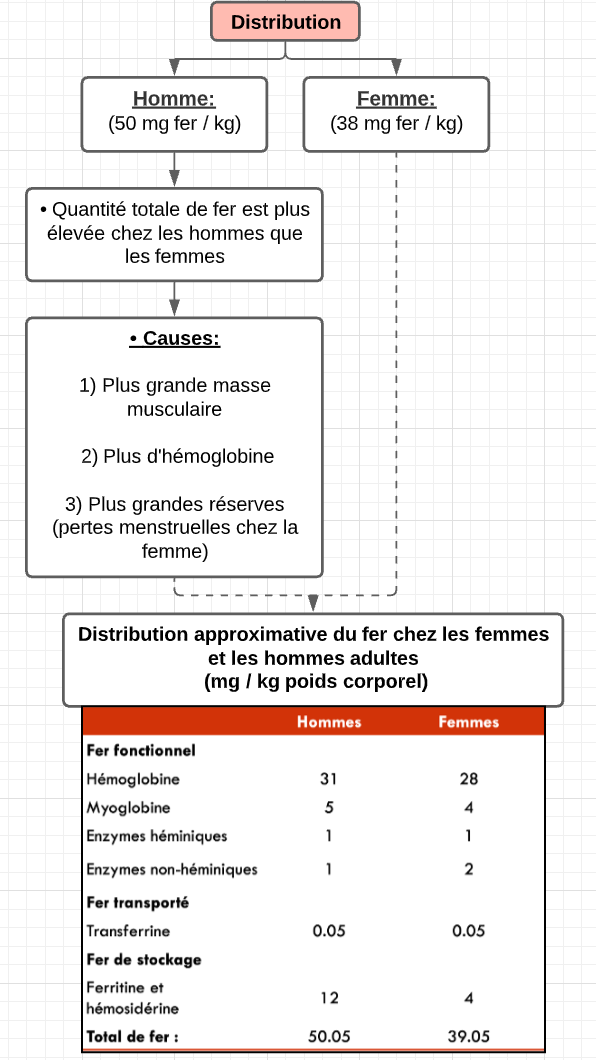 Quelle est la distribution du fer chez les hommes et les femmes?