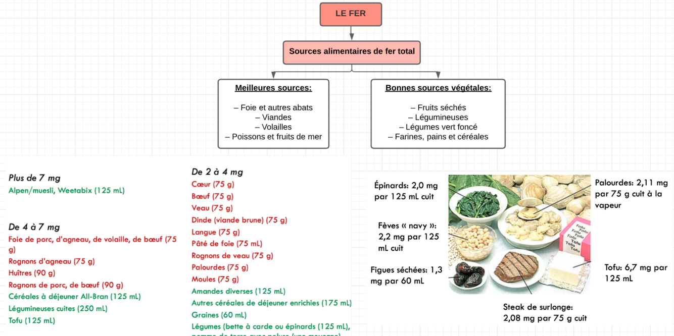 Quelles sont les Sources alimentaires de fer total?
