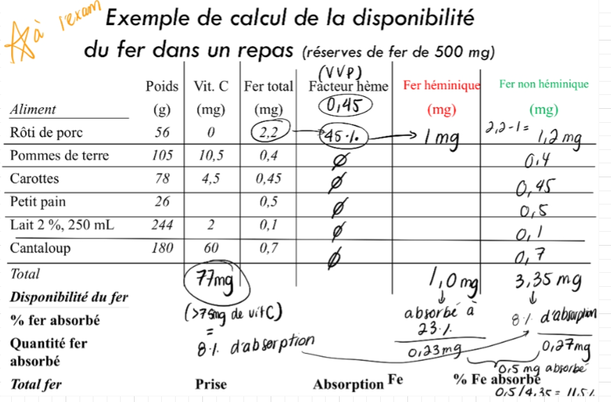 Effectuez le calcul du % du fer disponible pour l’absorption: