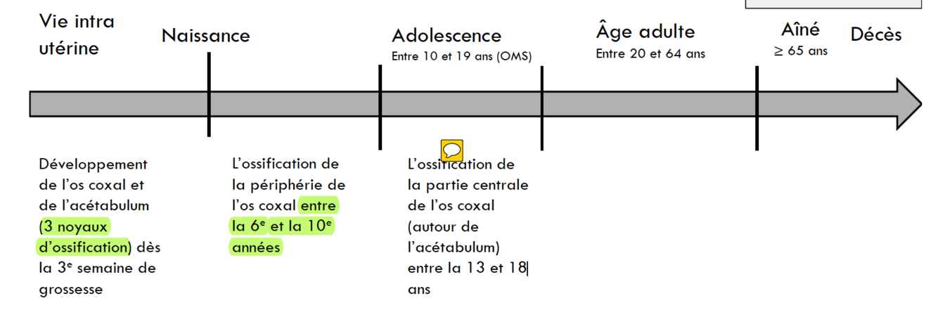 1- L’ossification de la partie centrale de l’os coxal (autour de l’acétabulum) entre la 13 et 18 ans