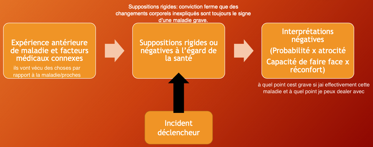 explique le modèle cognitif-comportemental du développement de l’anxiété à l’égard de la santé (étiologie de la crainte excessive d’avoir une maladie) (4)