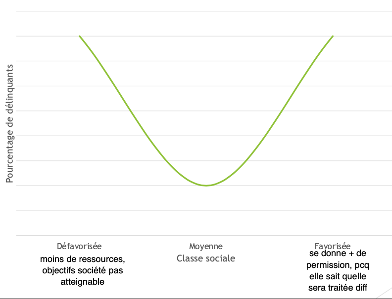 - Le lien entre classe et délinquance aurait la forme d’un U! (classe moyenne taux le plus faible de la criminalité)