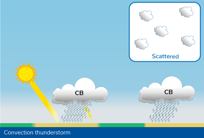 With convenction thunderstorms, clouds are scattered over a large area