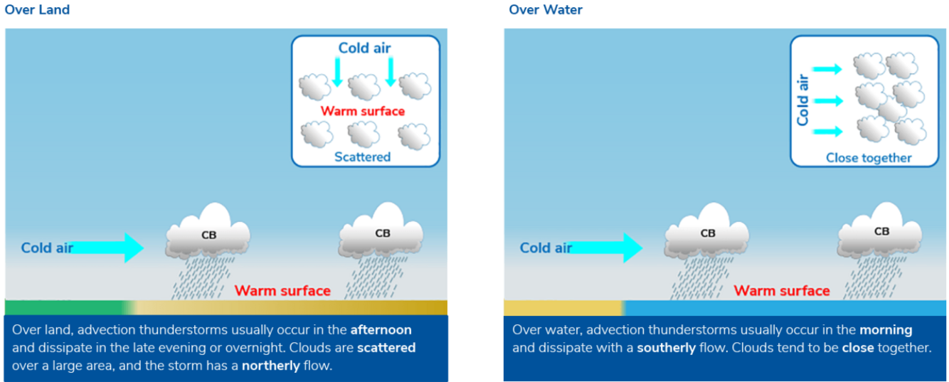 Advection thunderstorms are caused by cold air passing over a warm surface. They may occur over land or over water