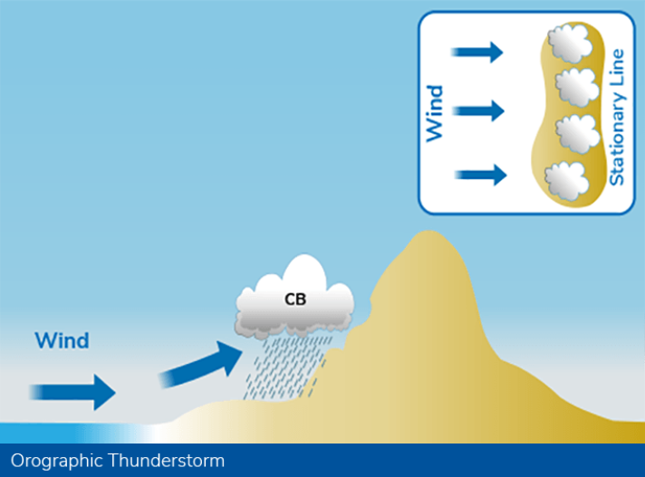 With orographic thunderstorms, clouds form a stationary line