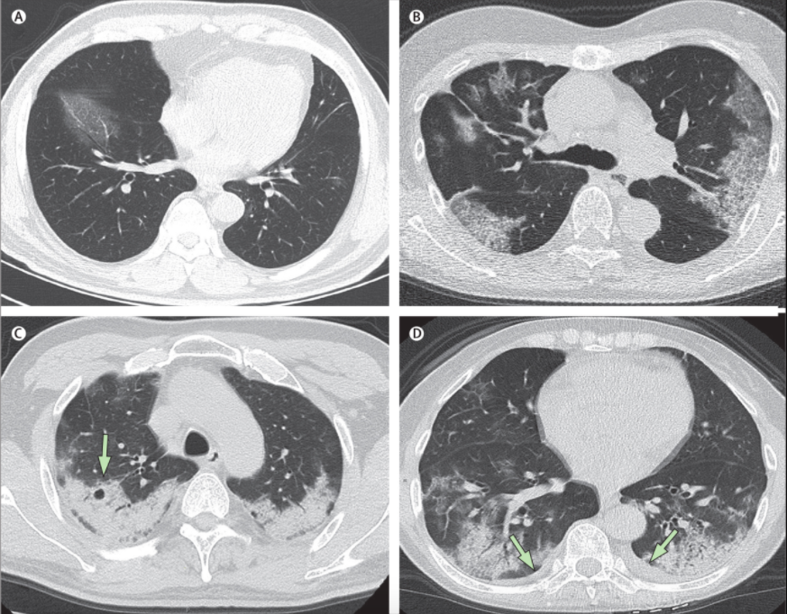 This endotheliitis is associated with diffuse thickening of the alveolar wall and infiltration of mononuclear cells and macrophages into the airspaces, which collectively are seen as ground-glass opacities in the lungs on CT imaging. This may progress to ARDS.