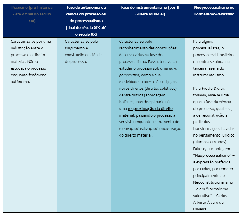 Quanto a história do processo brasileiro: Na fase de autonomia da ciência do processo, passa-se a estudar o processo sob uma nova perspectiva, como a sua efetividade, o acesso à justiça, os novos direitos.
