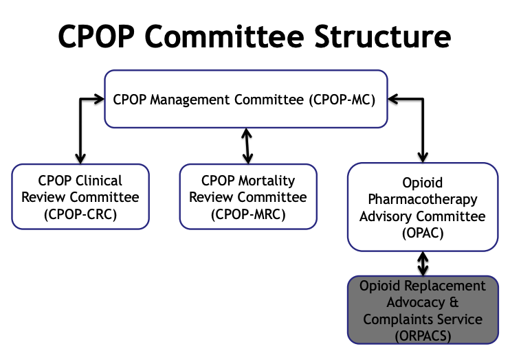The CPOP Clinical Review Committee meets to review and endorse applications for OST that fall outside the WA Policies and Procedures, to review the management of clients with special dosing approval, and to respond to clinical management issues which may impact upon service providers and clients of the Program