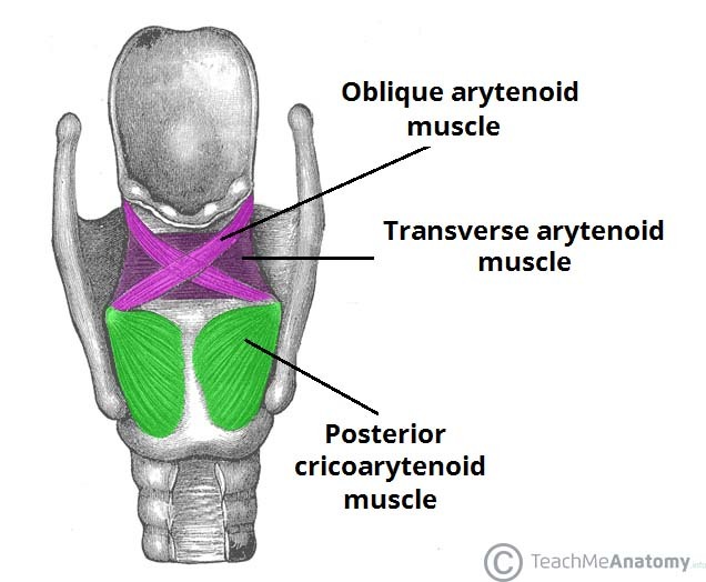Posterior crico-arytenoids: between the lamina of the cricoid and the arytenoid cartilages