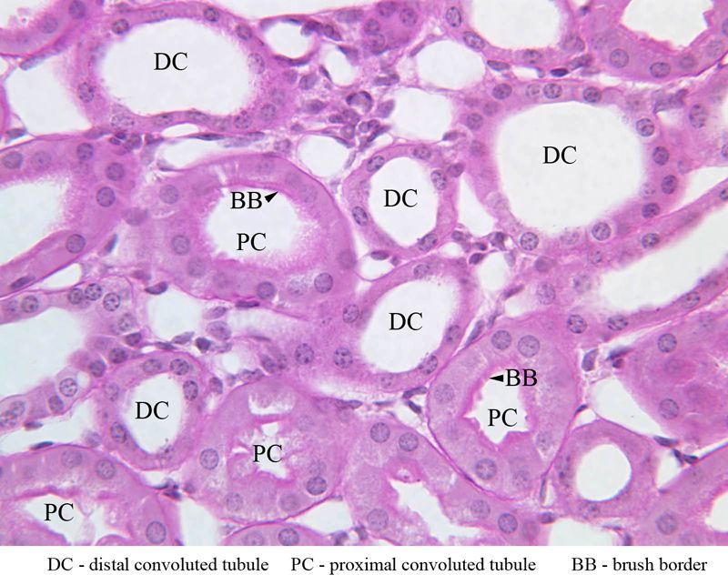 PCT has brush border on luminal surface, DCT does not / The DCT is lined with simple cuboidal cells that are shorter than those of the proximal convoluted tubule (PCT