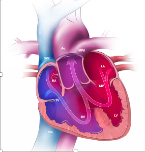 A large VSD (ventricular septal defect) below the truncal valve allows mixing of right and left ventricular blood [1]