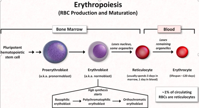 Haematopoietic stem cell (HPSCs) –> common myeloid progenitor cell –> (CMPC)Proerythroblast –> erythroblast –> reticulocyte – > erythocyte