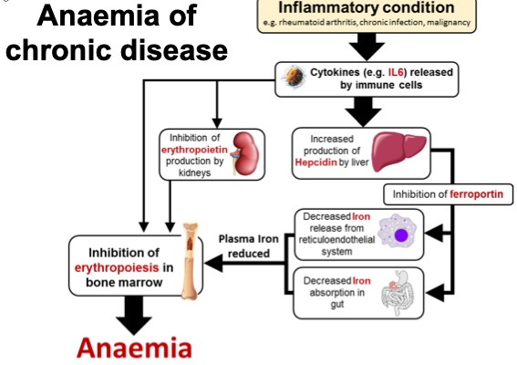Problem is with iron being absorbed in gut and iron getting out of macrophages, along with depressed erythropoietin release and erythropoiesis caused by inflammatory cytokines – need to treat cause inflammation