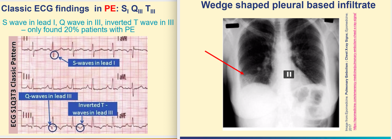 o CXR- possible small pleural effusion, peripheral wedge shaped density above diaphragm, focal oligemia. Most common finding with PE patients is a normal CXR, but used to excludes other diagnoses