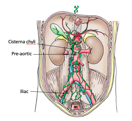Lymph from the GI tract drains into the pre-aortic lymph nodes (celiac, superior mesenteric and inferior mesenteric nodes)
