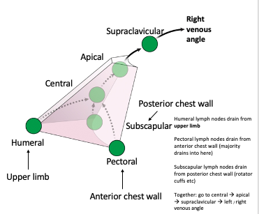 Pectoral lymph nodes drain from anterior chest wall (majority drains into here)