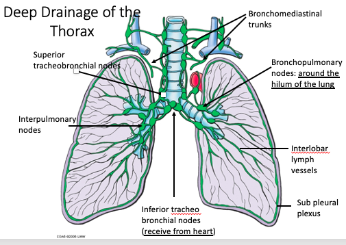 Sub pleural plexus –> interlobal lymph vessels –> interpulmnarry lobes –> inferior trachea bronchiol nodes –> superior trachea bronchiole lobes –> bronchomediastinal trunks –> L / R venous angle