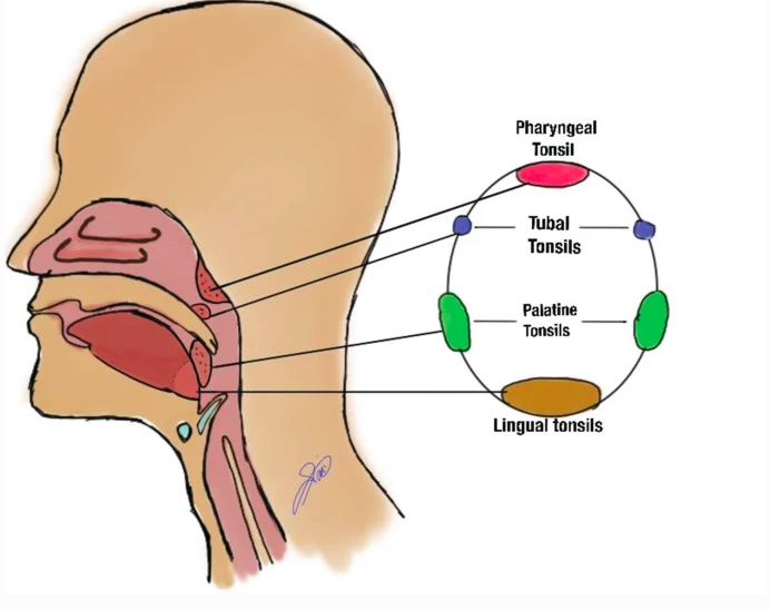 As well as small collections of lymphatic tissue disbursed throughout the mucosal lining of the pharynx (mucosa-associated lymphoid tissue, MALT).