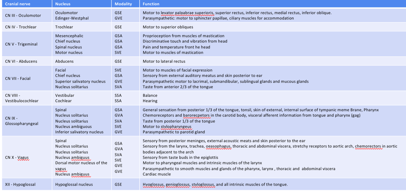 For each cranial nerve, draw a table that shows its origin, modality and function