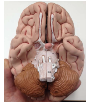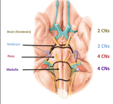 Label the brain, midbrain, pons and medulla and how many CNs there are