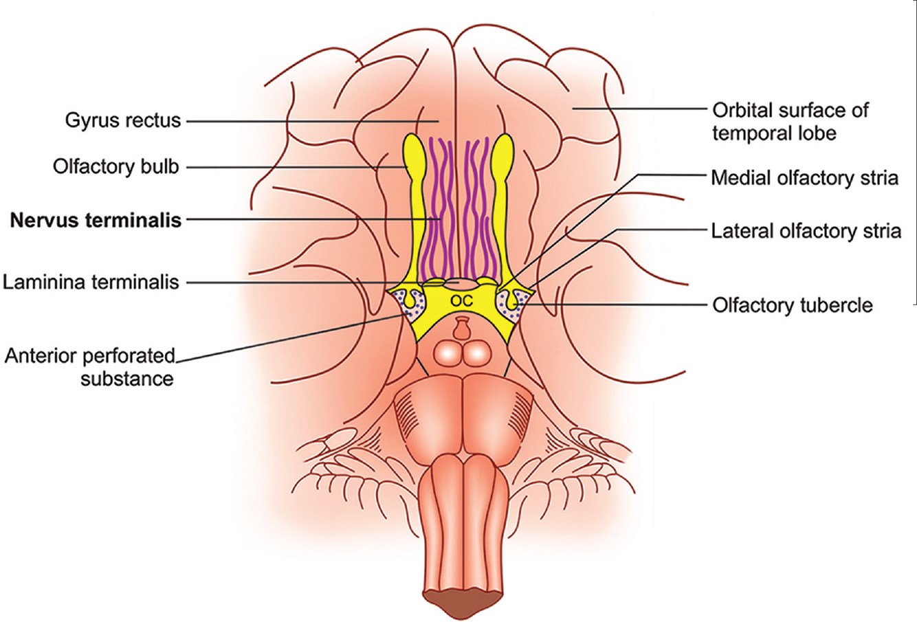 Serves as a conduit along which a population of neurones migrates from the olfactory placode into the pre-optic area and hypothalamus.