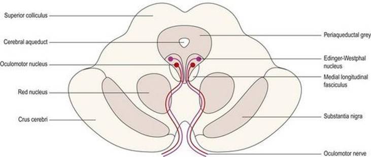 Immediately caudal to the oculomotor nucleus at the level of the inferior colliculus.