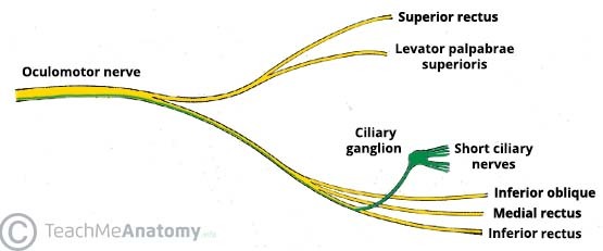MR, IR, IO, Ciliary ganglion via short ciliary nerves