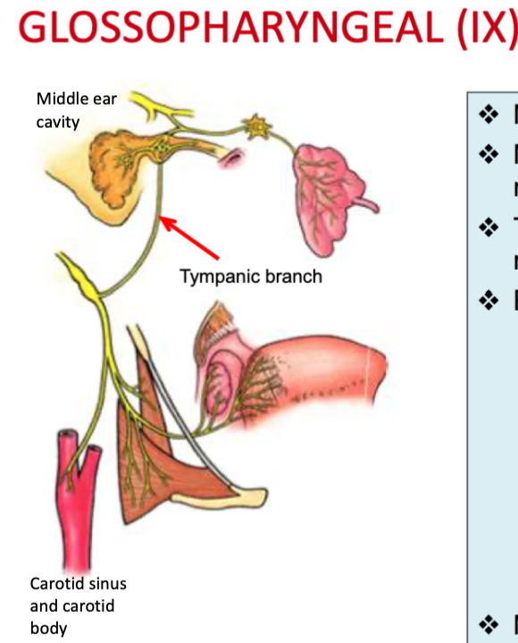 - General sensation from middle ear, oropharynx, palatine tonsil, inferior aspect of soft palate, posterior 1/3 tongue