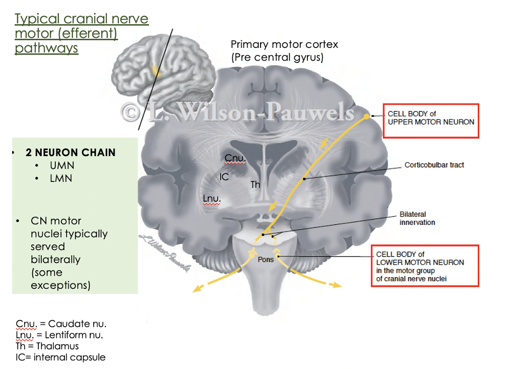 What is involved in the 2 neurone pathway of a typical CN motor (efferent) pathway?