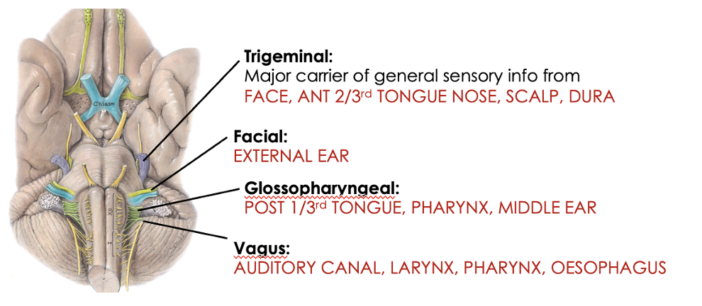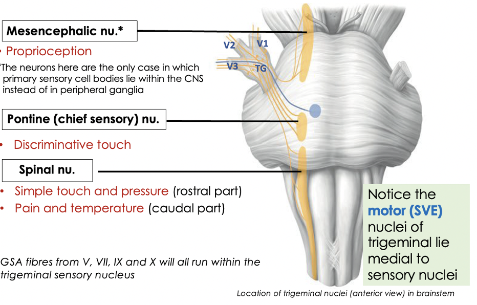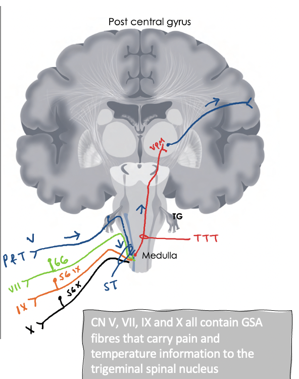 ALL of these CNs carrying GSA fibres travel to the trigeminal sensory nucleus