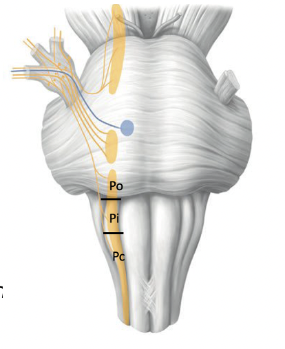 What are the 3 parts of the trigeminal sensory nucleus and which sensations do they receive?